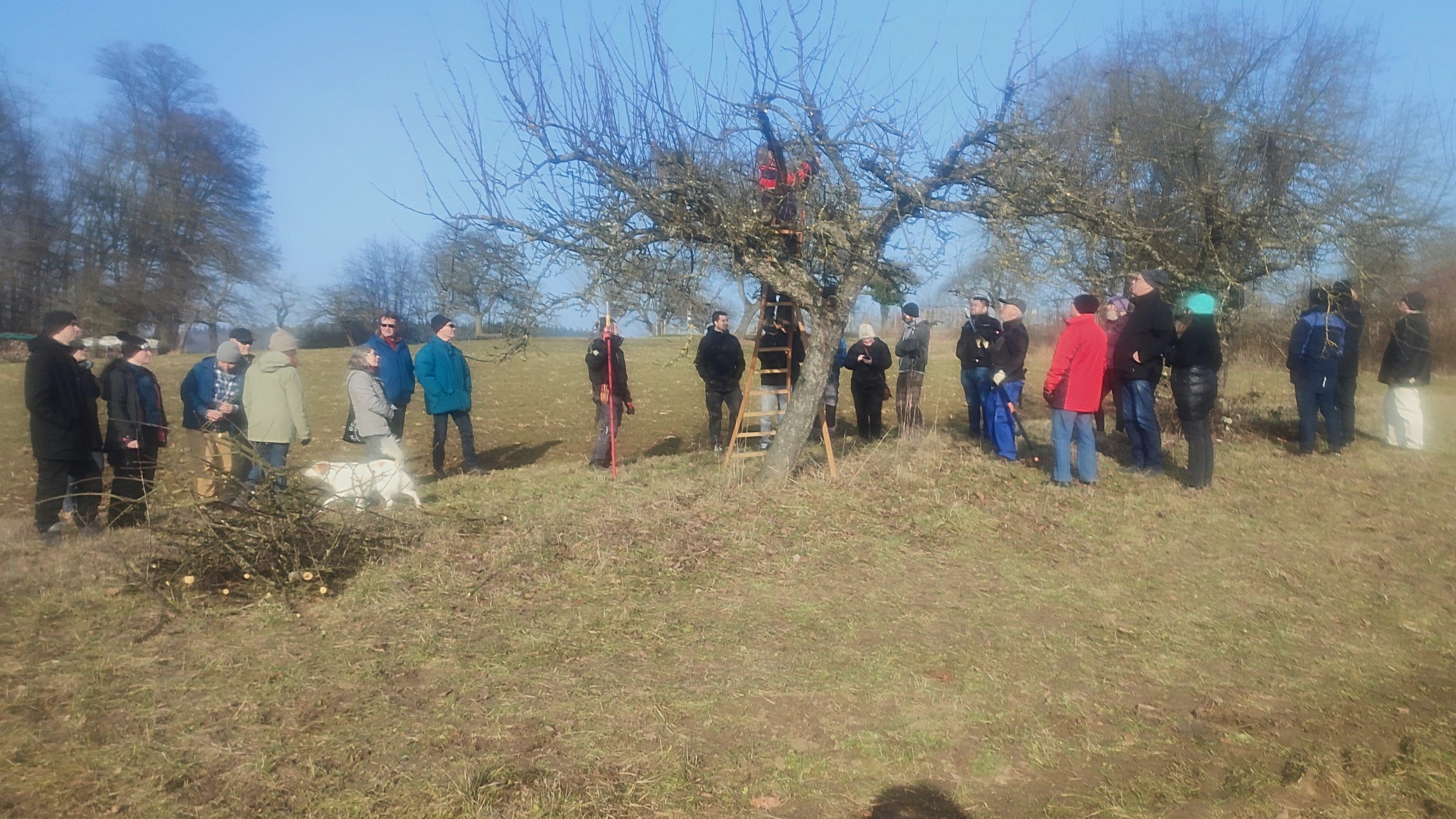 Am vergangenen Samstag konnten wir bei sonnigen, aber kalten Winterwetter rund 20 Interessierte beim Vereinsheim zum Schnittkurs begrüßen. Gemeinsam gingen wir zum Baum, an dem die Fachwarte Ralf Rothweiler, Erwin Dennig, unterstützt von Thomas Schaller, den notwendigen Schnitt erklärten.